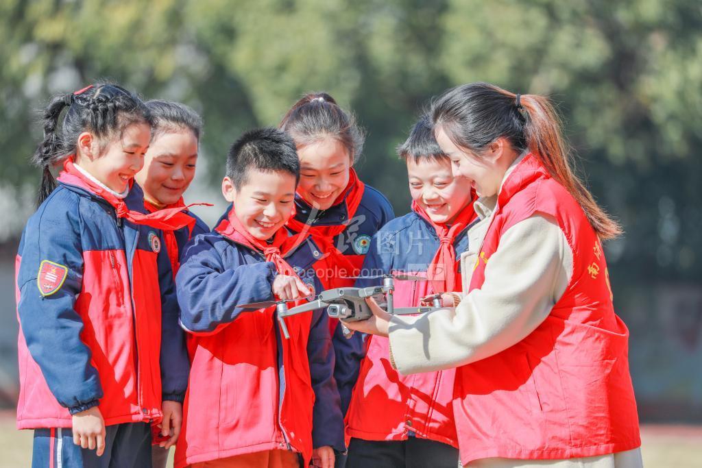 2021年1月14日,在浙江省湖州市南浔区和孚村泉生小学,科普志愿者在给小朋友讲解航拍无人机知识。
