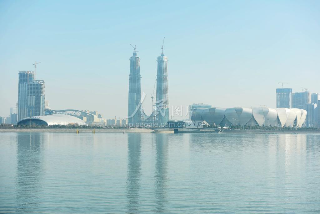 2021年1月14日,在钱塘江畔拍摄的杭州世纪中心双子塔楼。