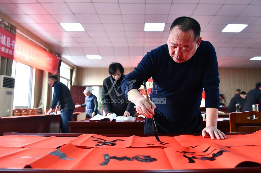 2021年1月14日,在湖北省通城县退役军人事务局会议室,十多位书法爱好者在书写对联,赠送给现役军人家属,退役军人等。