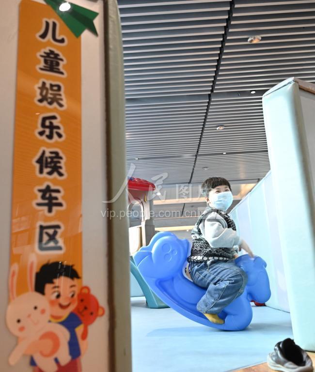 2021年1月14日,河南郑州,郑州火车站儿童娱乐候车区里玩耍的儿童。