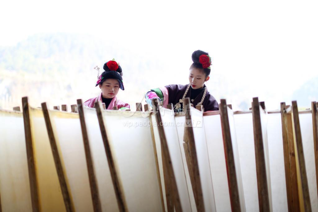 2021年1月14日,苗族村民在贵州省丹寨县南皋乡石桥村古法造纸作坊晾晒白皮纸。
