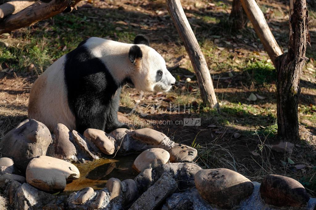 2021年1月14日,黄山市大熊猫生态乐园,大熊猫“华龙”正在玩耍小憩。