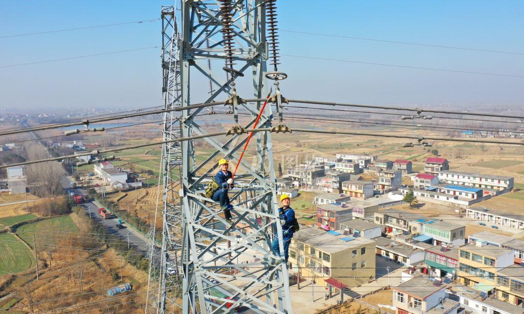2021年1月14日,安徽省滁州市供电公司的工作人员在60多米高的220千伏洪(凤阳县洪武变电站)定(定远县定远变电站)2C48输电线路上进行地电位带电检修。