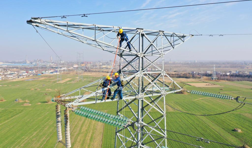 2021年1月14日,安徽省滁州市供电公司的工作人员在60多米高的220千伏洪(凤阳县洪武变电站)定(定远县定远变电站)2C48输电线路上进行地电位带电检修。