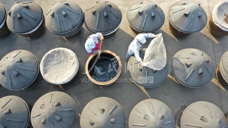 2021年1月17日,在位于浙江省湖州市德清县禹越镇的五味和食品有限公司古法酿醋生产基地,工人在晾晒区查看醋缸中的晒醋。