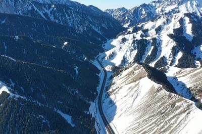 2021年1月17日,无人机航拍新疆伊犁霍城县果子沟大桥。果子沟大桥是连云港至霍尔果斯高速公路的重要桥梁,线路全长4.4千米,主要大桥长700米,称为新疆第一大桥。冬日的果子沟大桥,在周围群山雪岭逶迤的映衬下,显得雄伟壮观,目前,已经成为果子沟景区的主要景点。