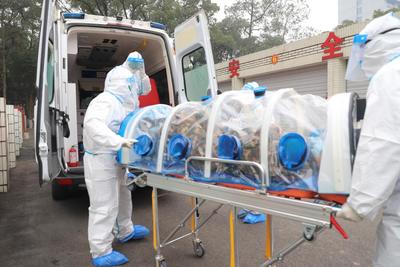 2021年1月28日,医务人员在演练中将“疑似病人”转运至医院