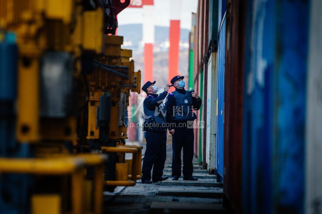2021年2月4日,许国利(左一)和同事在集装箱码头巡查。