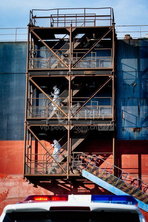 2021年2月4日,一艘来自澳大利亚的货轮停靠码头,许国利和同事身着防护服登船检查。