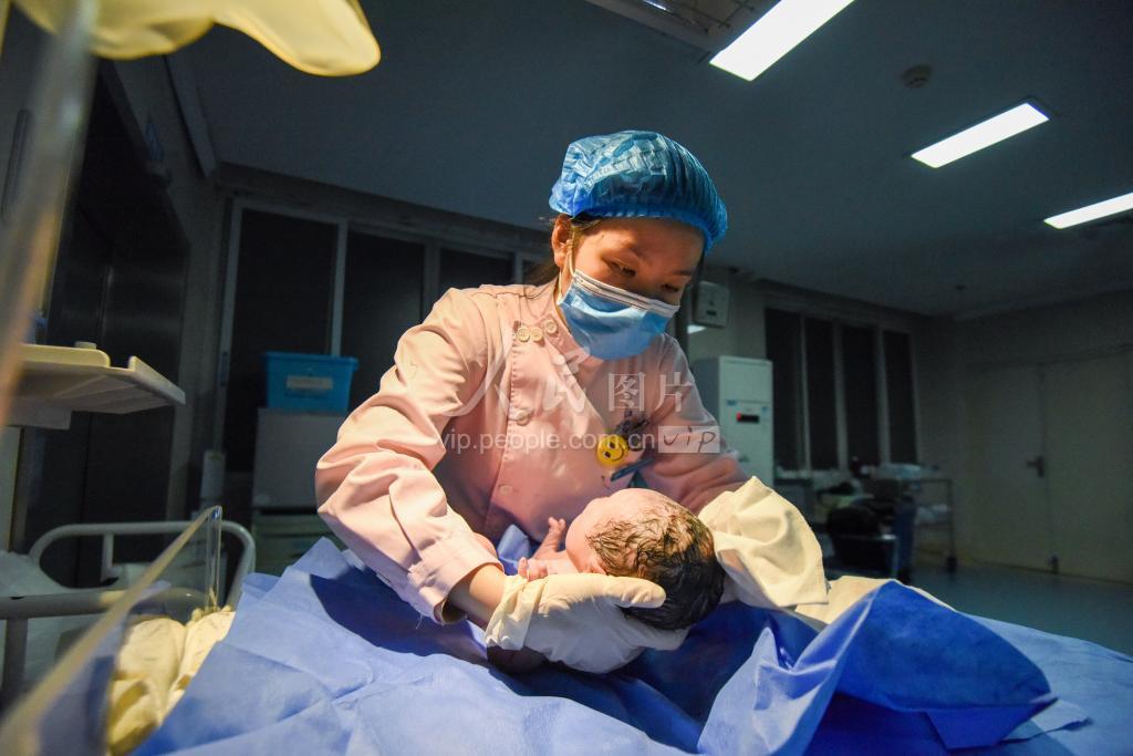 2021年2月11日,农历庚子鼠年除夕夜,在湖北省荆州市妇幼保健院的产科病房,当班护士在照料刚出生的婴儿豆豆。