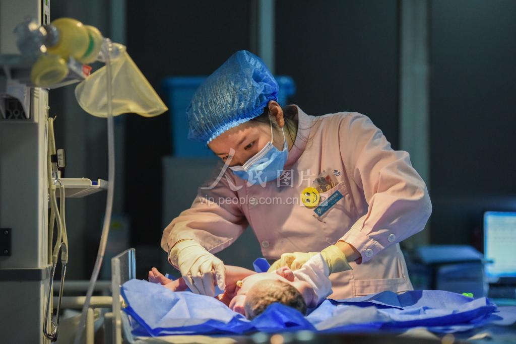 2021年2月11日,农历庚子鼠年除夕夜,在湖北省荆州市妇幼保健院的产科病房,当班护士在照料刚出生的婴儿豆豆。