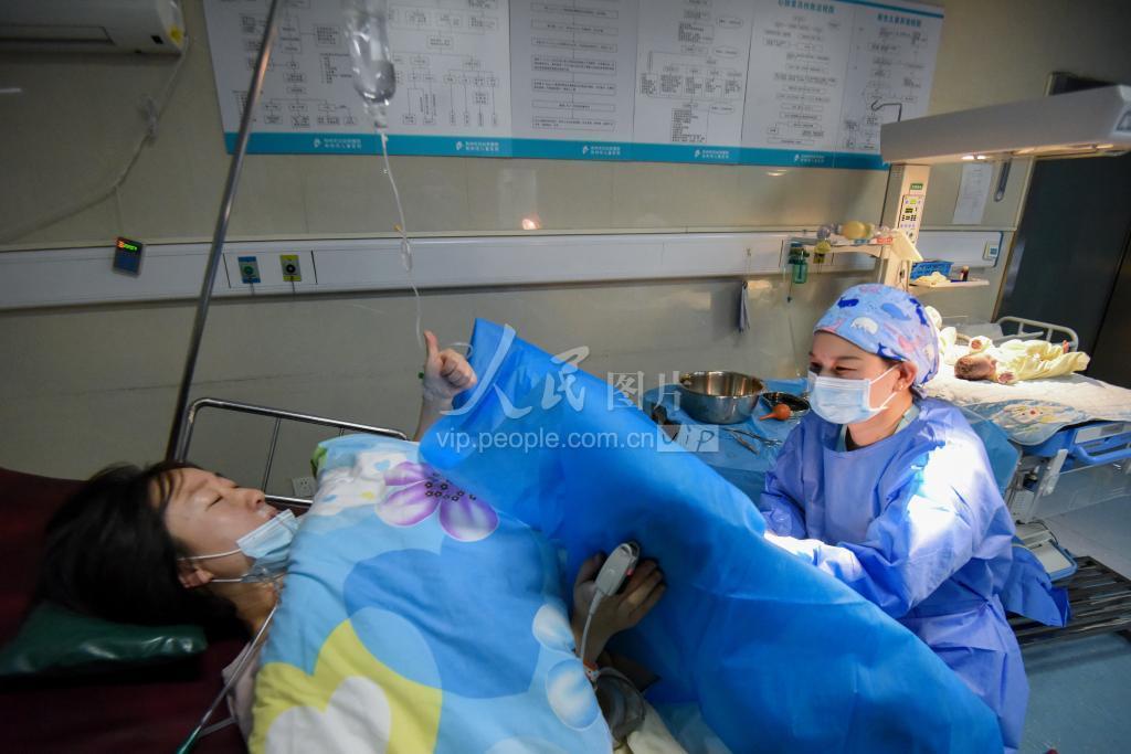 2021年2月11日,农历庚子鼠年除夕夜,在湖北省荆州市妇幼保健院的产科病房,产妇王露顺利生下婴儿后,为医护人员竖大拇指表示感谢。