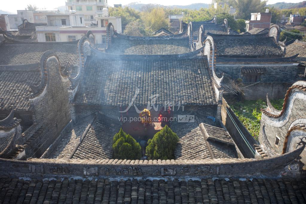 2021年2月14日,航拍广东省肇庆市封开县南丰镇汶塘村古建筑,雄狮闹新春。