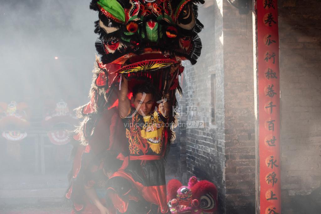 2021年2月14日,位于广东省肇庆市封开县南丰镇汶塘村古建筑,雄狮闹新春。