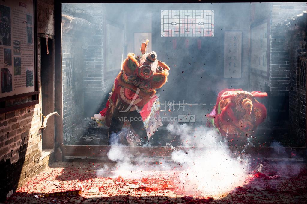 2021年2月14日,位于广东省肇庆市封开县杏花镇杏花村十二座伍家大屋祠堂,雄狮闹新春。