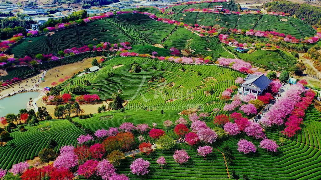 2021年2月17日,游客在福建省龙岩市漳平市永福镇台品樱花茶园观赏樱花。春节假期,永福镇台湾农民创业园台品樱花茶园里,40余个品种的数10万株樱花渐次绽放,红色的樱花与绿色的茶园交相辉映、美不胜收,吸引了众多游客纷至沓来,前来赏花观景。
