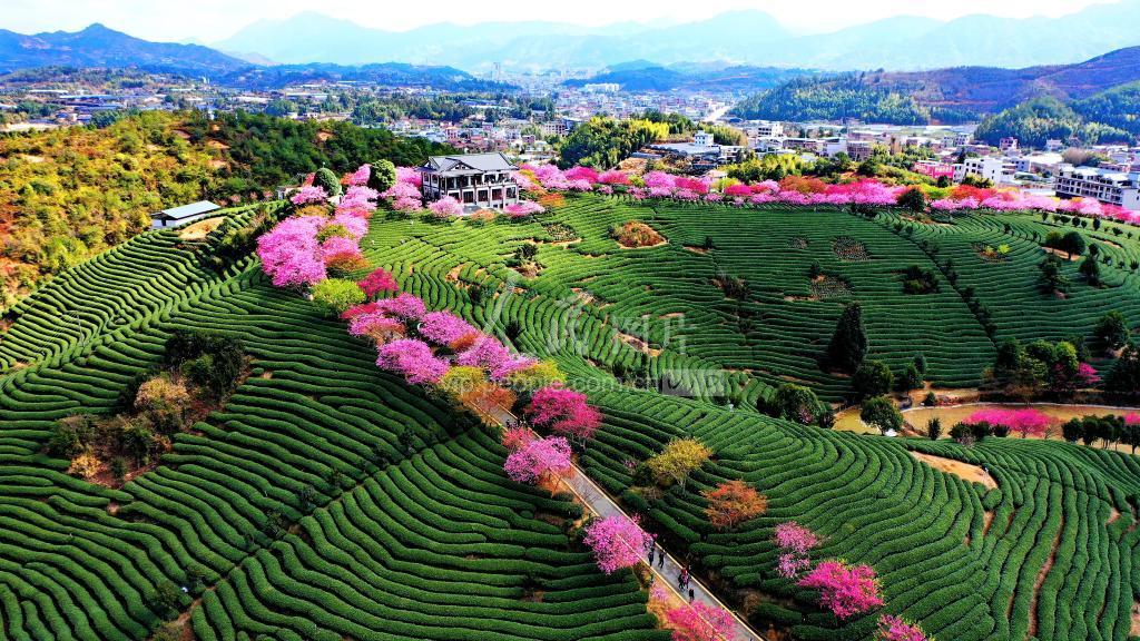 2021年2月17日,游客在福建省龙岩市漳平市永福镇台品樱花茶园观赏樱花。春节假期,永福镇台湾农民创业园台品樱花茶园里,40余个品种的数10万株樱花渐次绽放,红色的樱花与绿色的茶园交相辉映、美不胜收,吸引了众多游客纷至沓来,前来赏花观景。