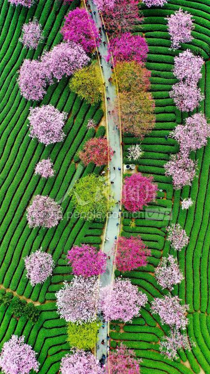 2021年2月17日,游客在福建省龙岩市漳平市永福镇台品樱花茶园观赏樱花。春节假期,永福镇台湾农民创业园台品樱花茶园里,40余个品种的数10万株樱花渐次绽放,红色的樱花与绿色的茶园交相辉映、美不胜收,吸引了众多游客纷至沓来,前来赏花观景。