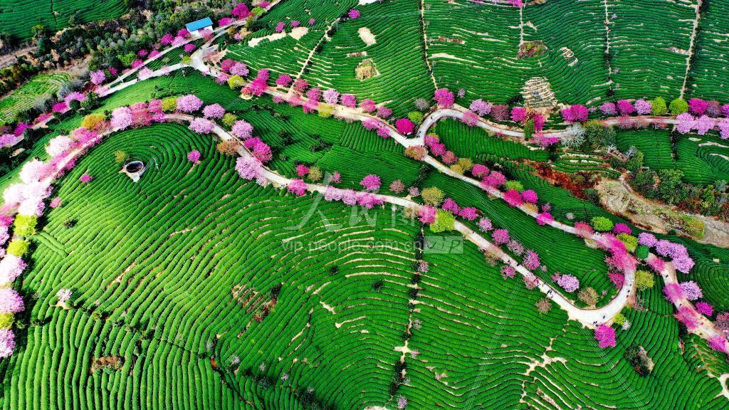 2021年2月17日,游客在福建省龙岩市漳平市永福镇台品樱花茶园观赏樱花。春节假期,永福镇台湾农民创业园台品樱花茶园里,40余个品种的数10万株樱花渐次绽放,红色的樱花与绿色的茶园交相辉映、美不胜收,吸引了众多游客纷至沓来,前来赏花观景。