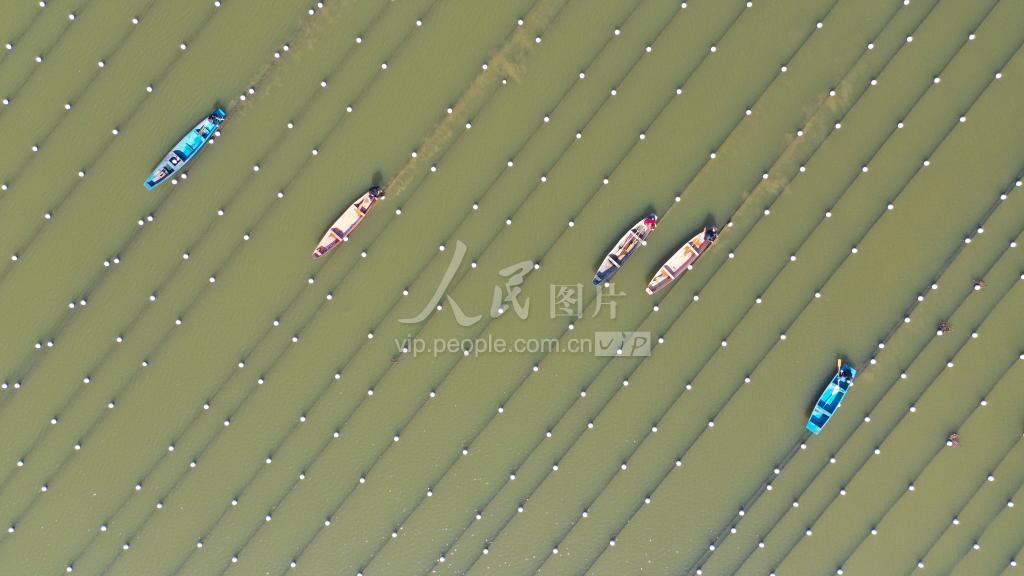 2021年2月18日,,蚌农在浙江省湖州市德清县洛舍镇的小山漾珍珠生态养殖基地的水面上作业,一派水上“春耕”忙碌的景象。