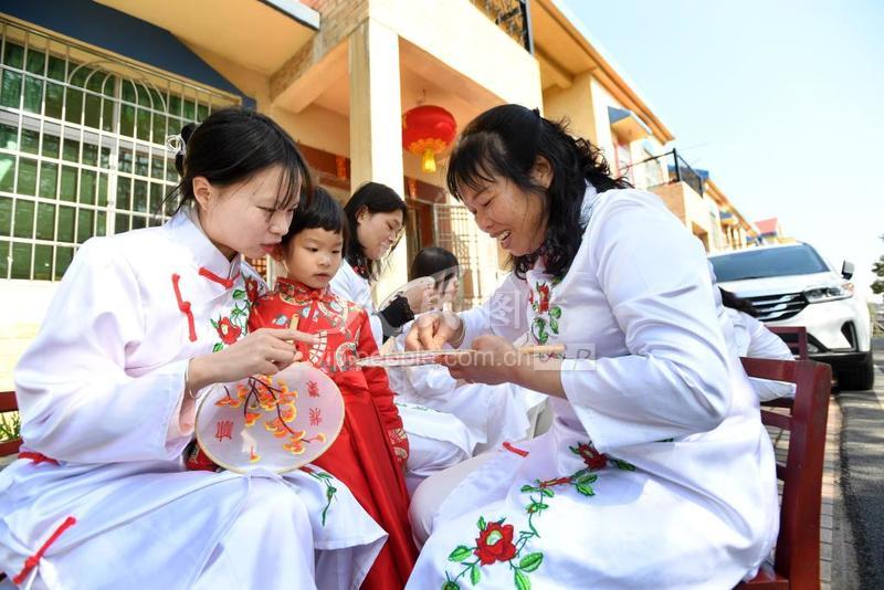 2021年2月19日,江西省宜春市上高县敖山镇洋林归侨少数民族聚居村村民欢聚一堂,一边刺绣一边拉着家常。 洋林归侨少数民族聚居村前身为1982年国侨办为安置归国东南亚难民华侨而设立的国营果业农场,村民由瑶、侗、傣、壮、京、苗、汉7个民族组成,共101户,410人。近年来,随着侨居工程、产业融合示范点建设、新农村建设、特色乡村旅游等项目建设纷纷落地,该村特色产业活力迸发,乡村面貌焕然一新,侨民们的日子也一天比一天更红火。