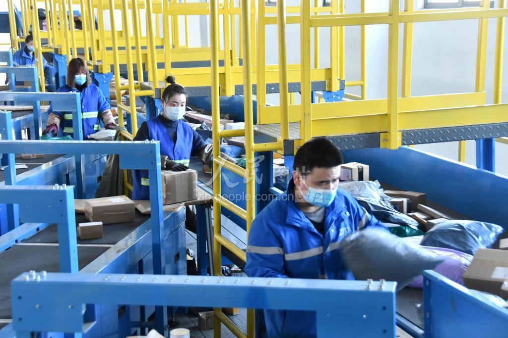 2月19日,工作人员正在河北省邯郸市永年工业园区的中通快递转运中心分拣快递。