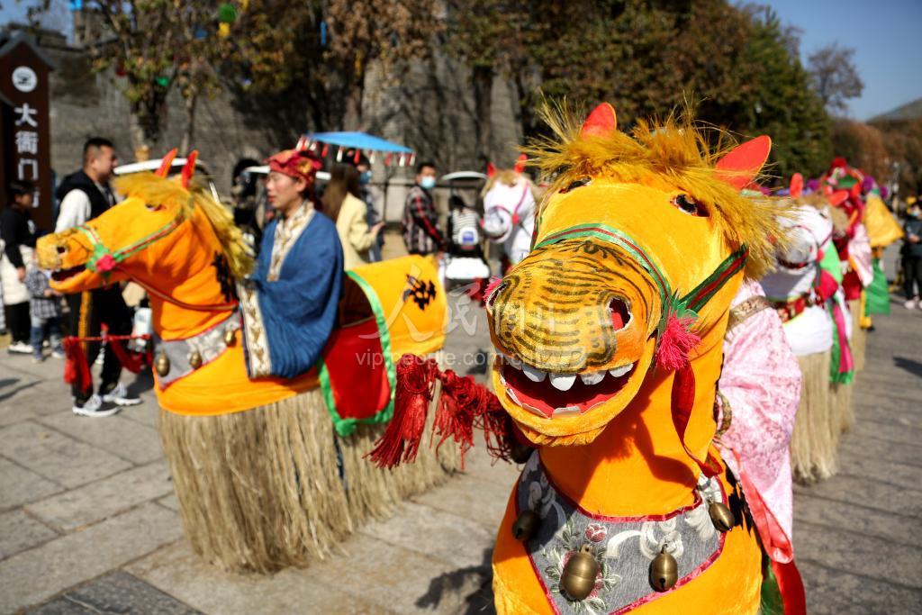 2021年2月21日,民间艺人在山东省枣庄市台儿庄古城向游客表演竹马。