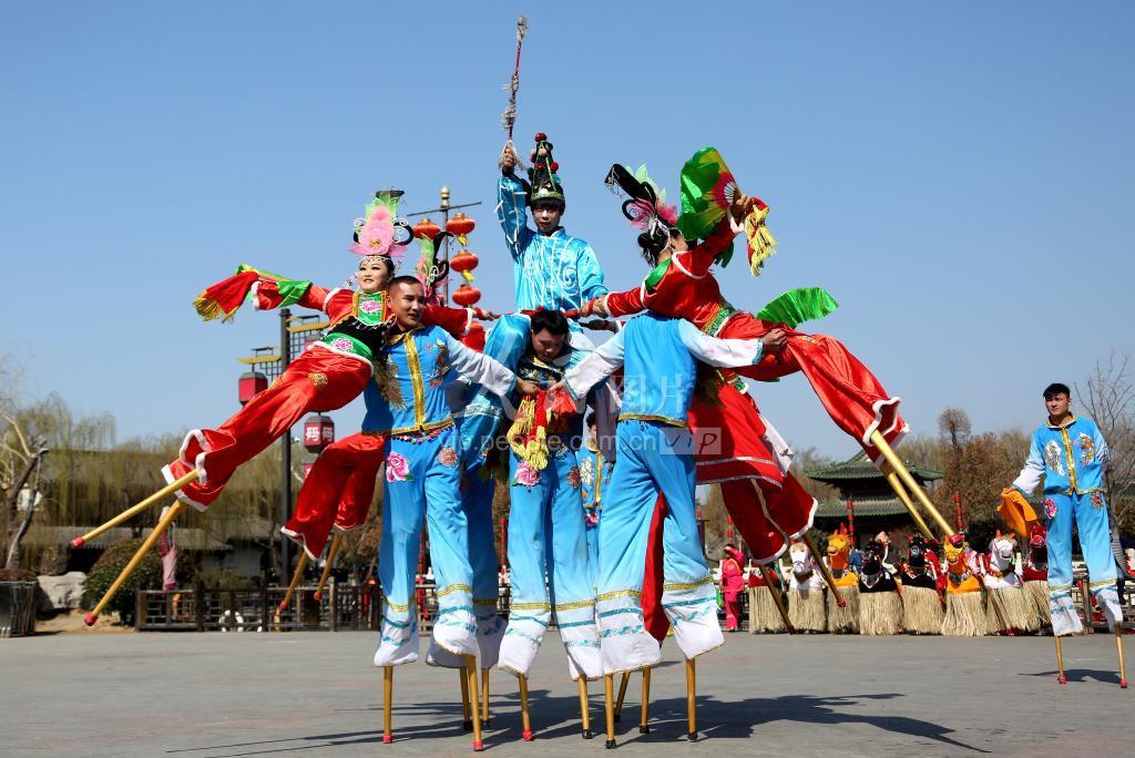 2021年2月21日,民间艺人在山东省枣庄市台儿庄古城向游客表演踩高跷。