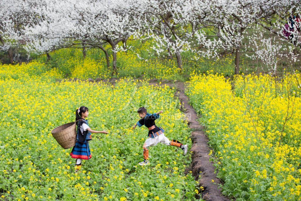 2021年2月20日,广西南丹县城关镇莲花村落花坪,金灿灿的油菜花与百亩的如雪的黄腊李花交相辉映,景致如诗如画,吸引了众多游客前来赏花。身着白裤瑶民族特色服装的孩子,在花海中尽情玩耍。