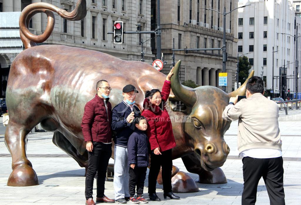 2021年2月23日,牛年新春,游客打卡上海“外滩牛”,摸摸牛头,沾沾“牛气”。据了解,“外滩牛”由国际著名雕塑家、“华尔街牛”的创作者阿图罗·迪·莫蒂卡创作,于2010年上海世博会开幕之际亮相,成为外滩金融广场的地标之一。