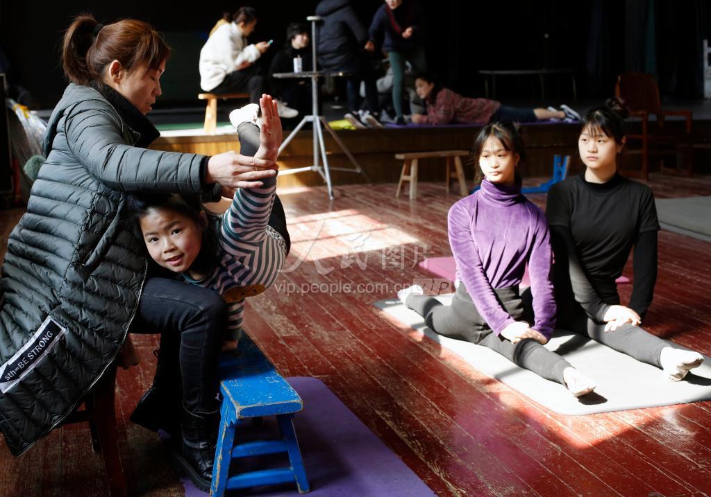2月23日,安徽安庆杂技团新春开训首日,小演员在教练指导下在认真训练基本功。