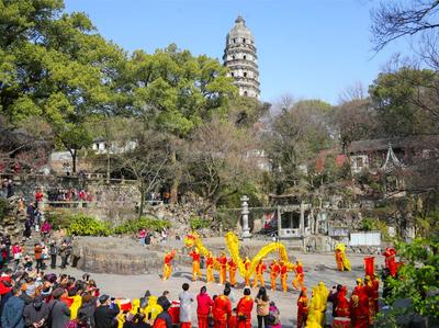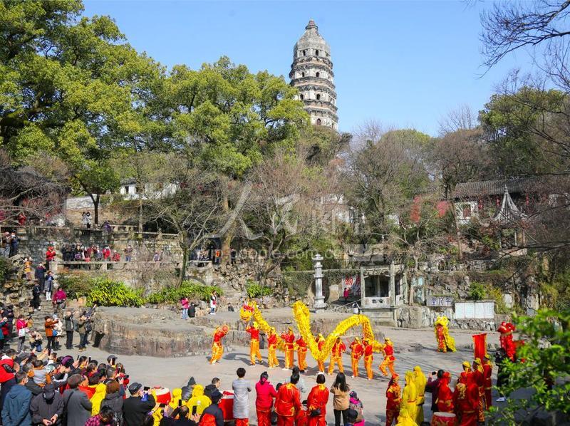 2021年2月24日,苏州虎丘景区,迎元宵舞龙舞狮展演带来欢乐喜庆气氛。