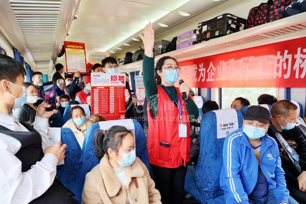 2月25日,广州开往宁波的K210次列车上,企业工作人员在车厢内向旅客介绍招工信息。