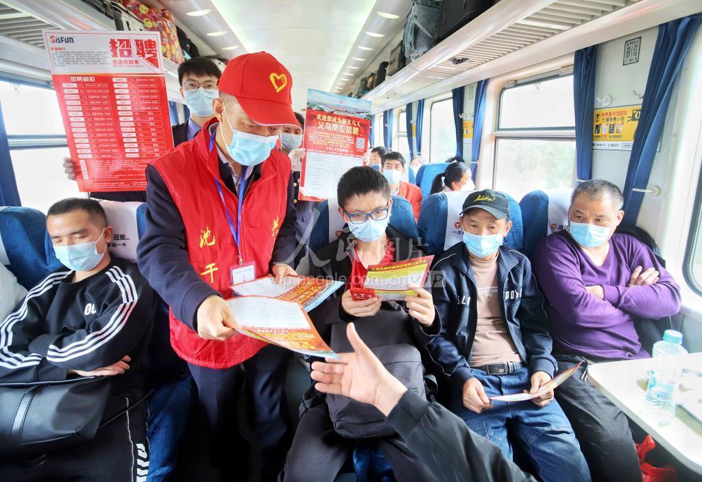 2月25日,广州开往宁波的K210次列车上,义乌市招商局工作人员在向旅客宣传招工信息。