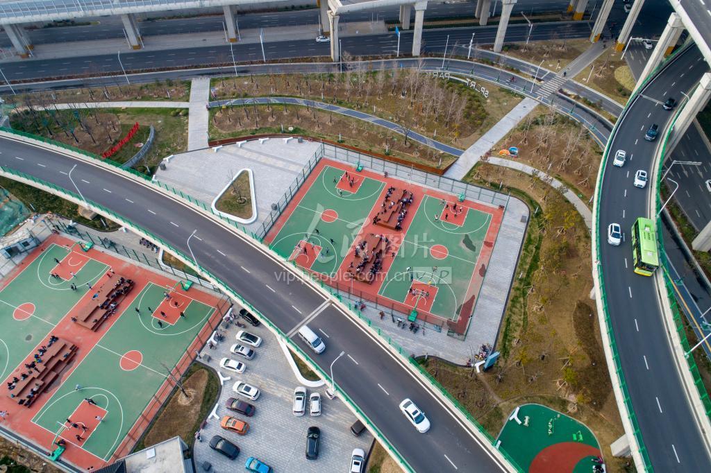 2021年3月13日,在江苏省淮安市内环高架西坝互通立交桥下,市民在体育公园中打篮球。淮安市充分利用内环高架桥下的空间,建设城市的绿色屏障和市民的活动场所,既节约了土地资源,更方便周边居民休闲健身。