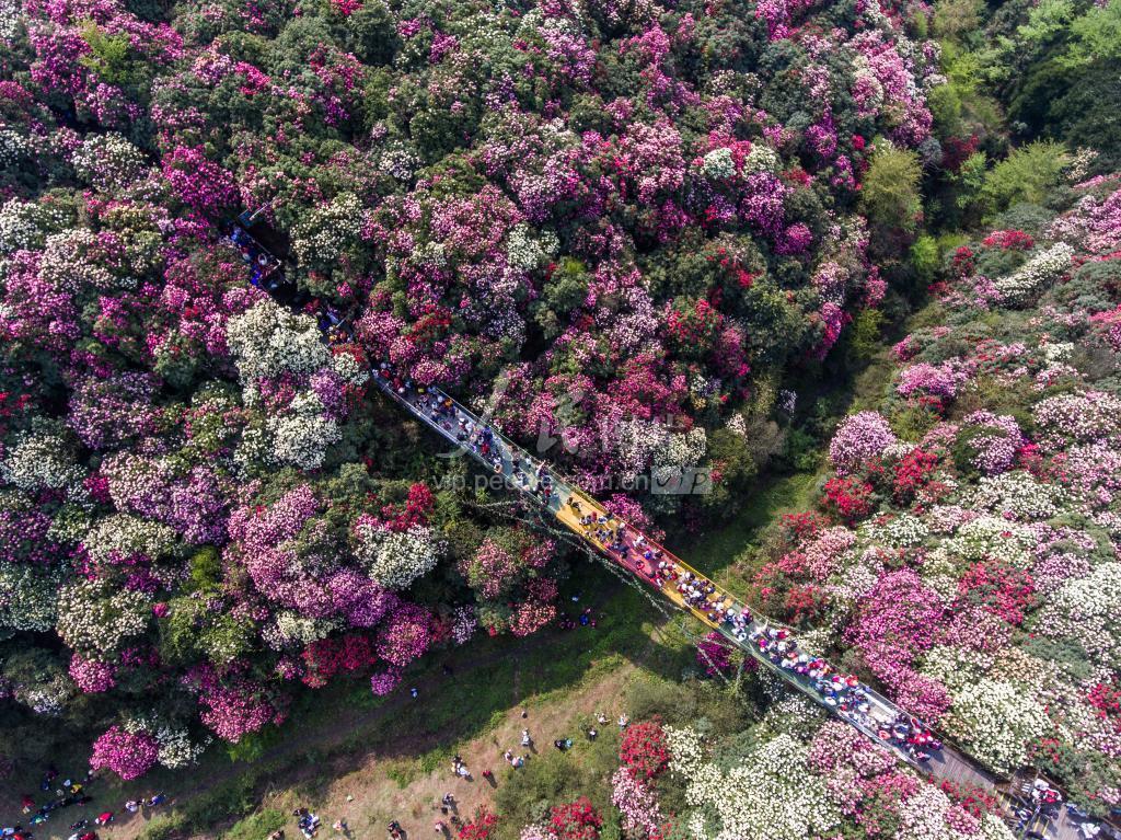 随着气温的回升,位于贵州省毕节市百里杜鹃管理区的120多平方公里的原始杜鹃林迎来最佳赏花期。杜鹃花漫山遍野,一路繁花似锦,游人漫步花间赏花留影,感受春天的气息。