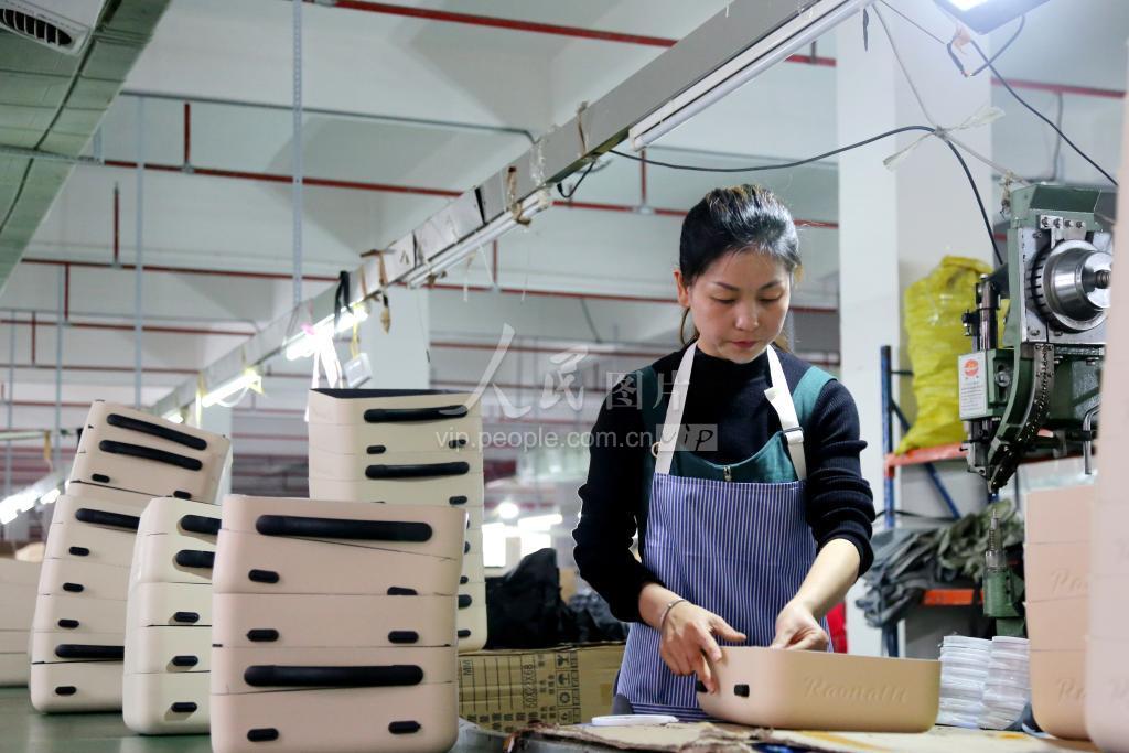 2021年4月8日,在江西省吉安市峡江县水边镇一家箱包生产企业,工人在赶制订单。