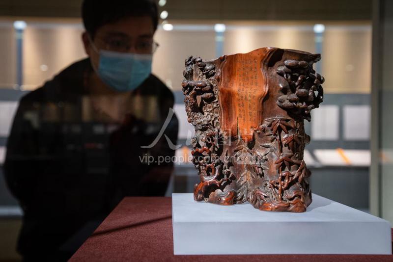 2021年4月8日,观众在南京博物院“妙手文心——南京博物院藏竹木牙角珍品特展”上观看展出的松鹤竹梅图竹笔筒。