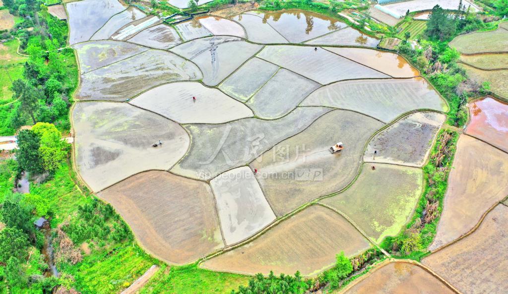 2021年4月9日,在江西省吉安市永丰县佐龙乡棱溪村,村民在水稻田中忙于春耕生产。