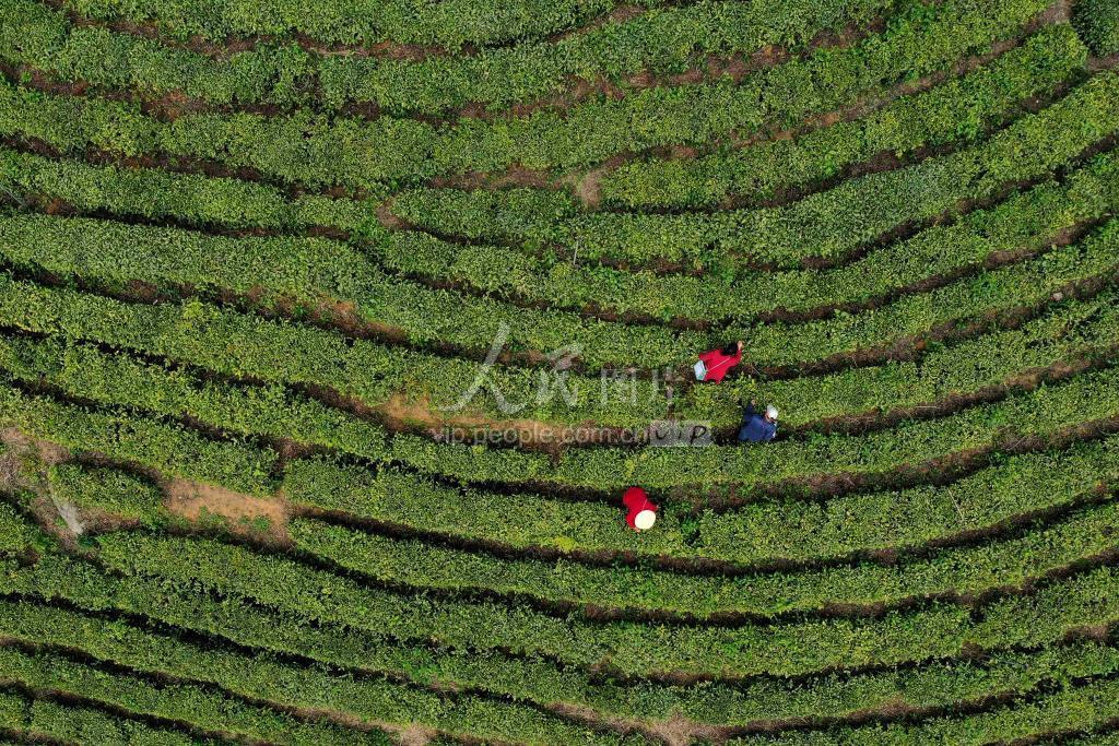 2021年4月8日,村民在湖北省襄阳市保康县店垭镇望粮山村茶园采摘茶叶。
