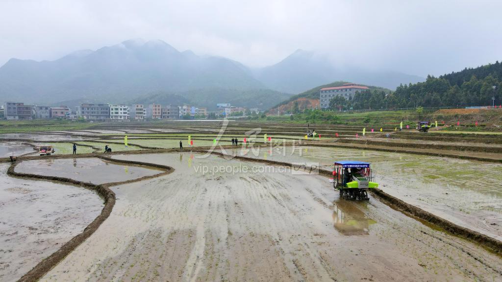 2021年4月9日,湖南省常宁市庙前镇双凤村村民驾驶插秧机在水田里来回奔驰,一排排娇嫩的秧苗转瞬之间便立在田间,一派生机盎然的景象。