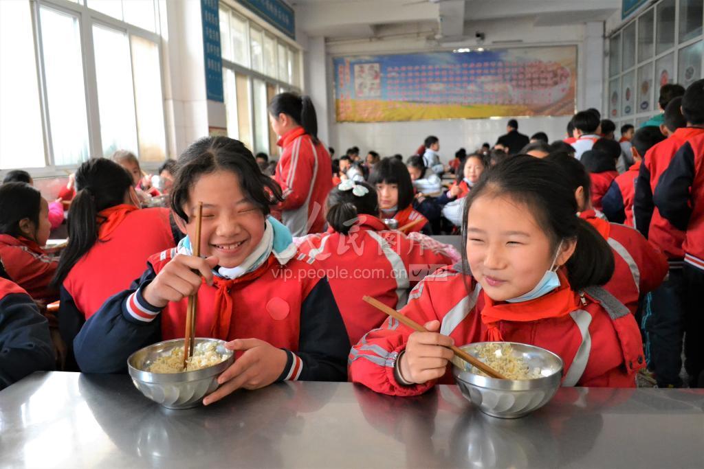 2021年4月9日,湖北省十堰市郧阳区柳陂镇中心小学学生们在食堂里吃“安全放心餐”。