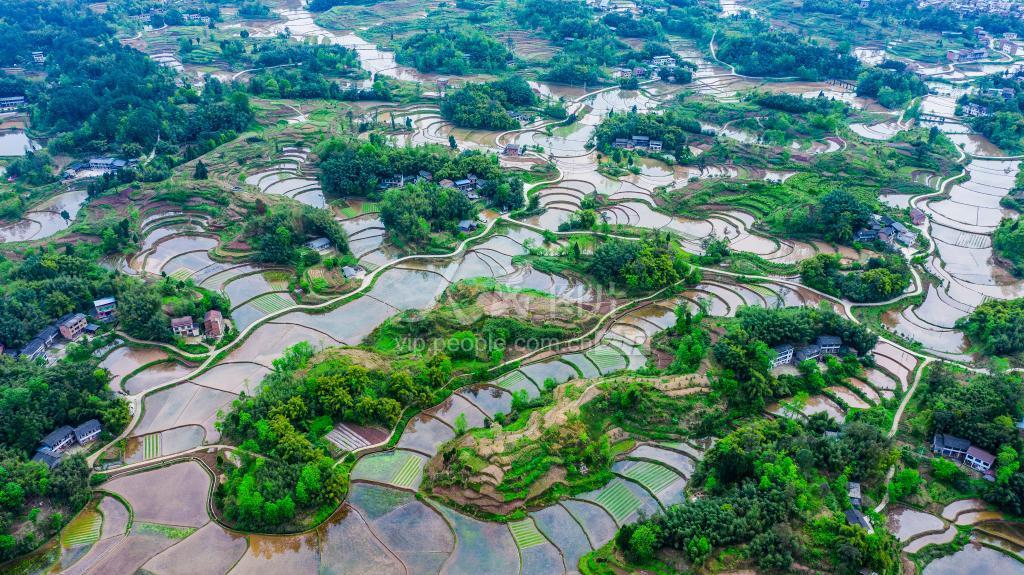 2021年4月9日,重庆市梁平区明达镇新益村,平整的水泥公路四通八达,连接农家,与春水满灌的稻田相映成画。