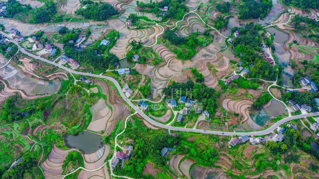 2021年4月9日,重庆市梁平区明达镇新益村,平整的水泥公路四通八达,连接农家,与春水满灌的稻田相映成画。