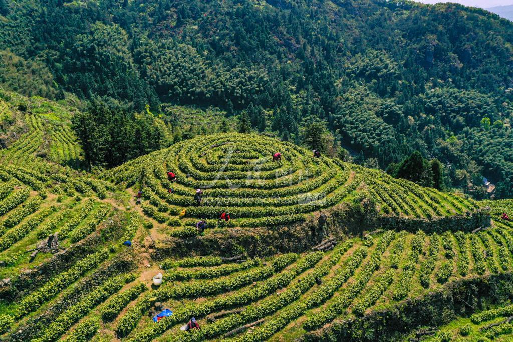 2021年4月9日,在浙江省温州市鹿城区山福镇山头,村民穿梭在茶垄间采茶。