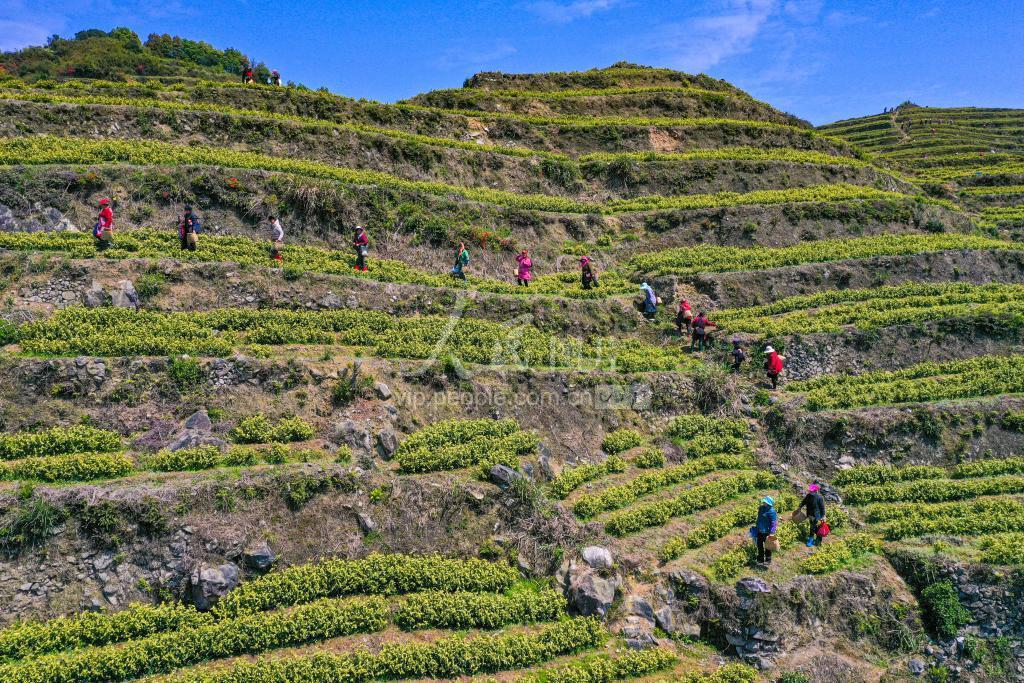 2021年4月9日,在浙江省温州市鹿城区山福镇山头,村民穿梭在茶垄间采茶。
