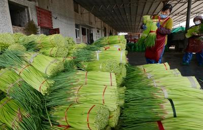 2021年4月9日,中牟县东关农贸大蒜市场,工作人员在整理早熟蒜薹。