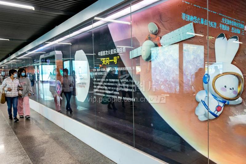 2021年4月14日,上海,南京东路地铁站文化长廊内,“建党100周年 辉煌成就·开启中国航天新的征程”主题展吸引不少过往市民驻足观看。 据悉,本次展览由国家航天局探月与航天工程中心、嫦娥奔月航天科技(北京)有限责任公司、我们的太空创新实践中心和上海地铁公共文化发展中心联合举办,通过图片、视频、实物展陈和AI互动等丰富多样的表现形式,为市民乘客科普中国航天历程,丰富群众的通勤之旅。