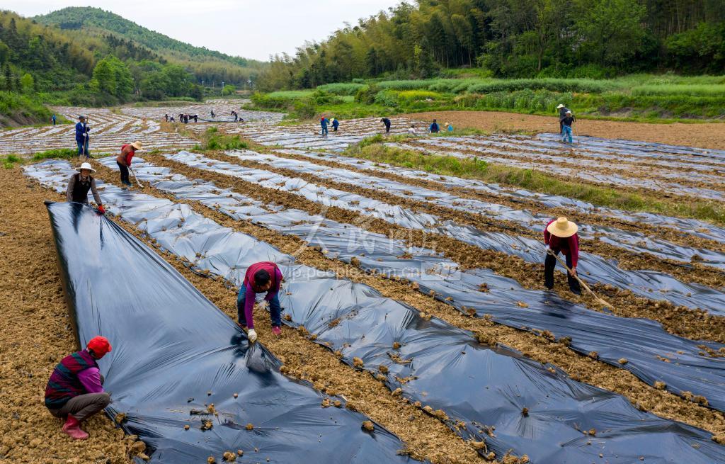 2021年4月19日,安徽省合肥市庐江县龙桥镇凌安村,农民正在地膜覆盖种植药材黄蜀葵。 近年来,庐江县围绕“一村一品”建设,因地制宜,引导农民因地制宜发展种植、养殖、加工等特色产业,积极实施“农村实用人才培训”工程和新型职业农民的系统培训,推动产业发展壮大,引领群众脱贫致富奔康,助力乡村振兴跑出“加速度”。 截至目前,该县村村有主导产业,户户有致富门路,全县“一村一品”的产业格局已全面铺开。