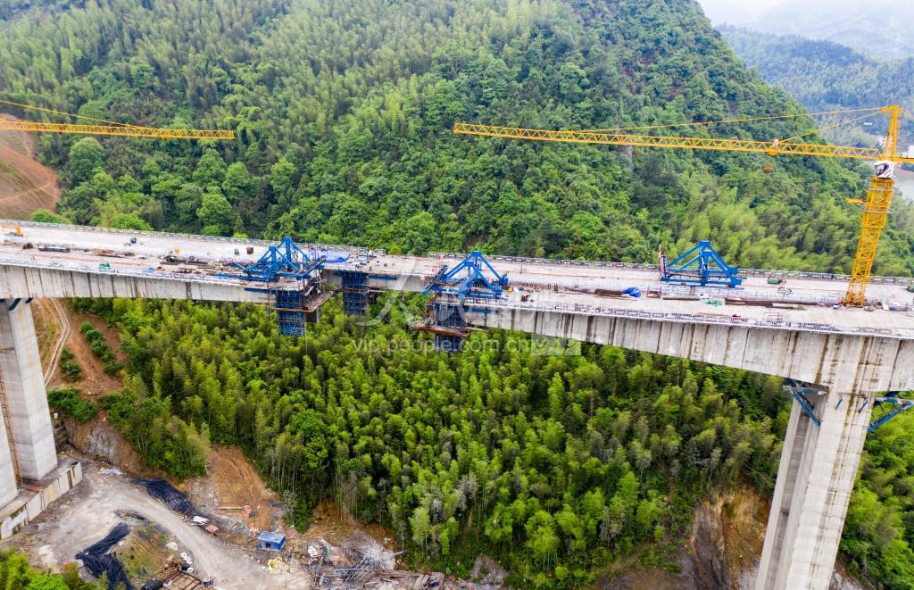 上传时间: 2021-05-04 18:36:57 图片说明: 2021年5月4日,江西萍乡市萍莲高速的建设者在源头水库特大桥施工作业。